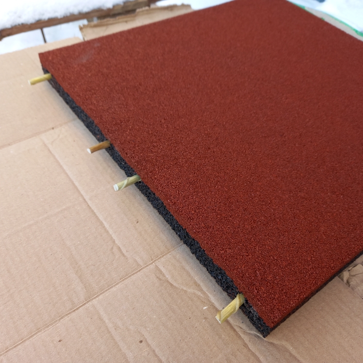 Качественная плитка состоит из двух слоев. Нижний слой сформирован из неокрашенной крошки крупной фракции и имеет более пористую структуру, которая отвечает за амортизирующие свойства. Верхний слой качественной плитки изготовлен из окрашенной крошки мелкой фракции.